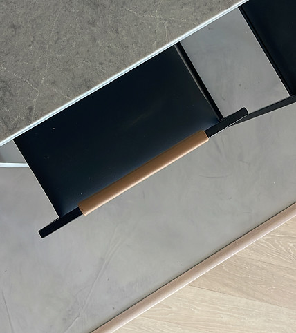 Using a wood floor for the living room downstairs and cement for the kitchen area gave it a natural divide without having to separate rooms as well as the seethrough fireplace that's also a natural room divider that provides a cozy as well as beautiful detail for the room. While choosing the right countertop for the kitchen I went for a warm grey stone that matched the concrete floor and a neutral beige for the cabinets for it all to match harmoniously together."